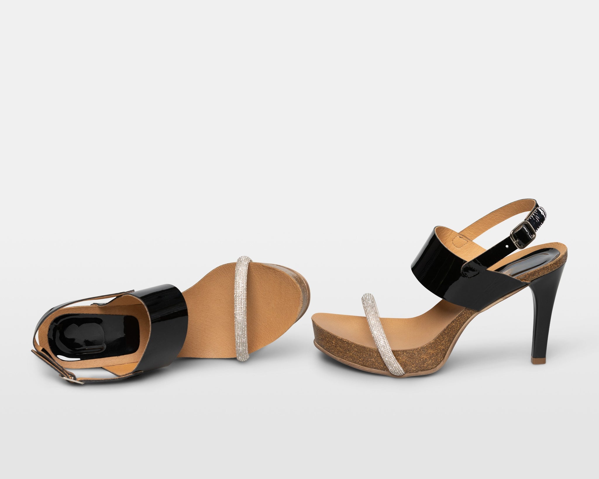 - Beautiful, stunning leather heels in Black patent leather with sparkly rhinestones on the lower strap, black patent leather top strap, thin ankle strap with silver buckle or slip and covered heel