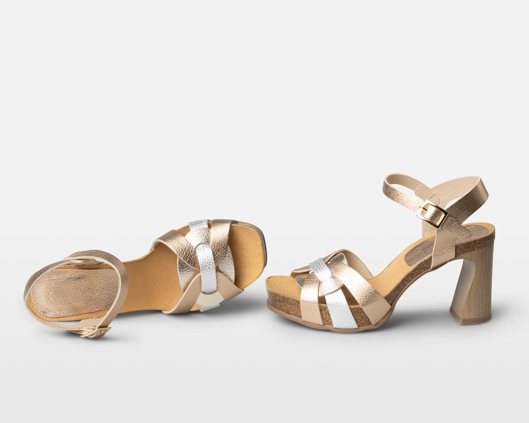 - Gold buckle on the ankle strap