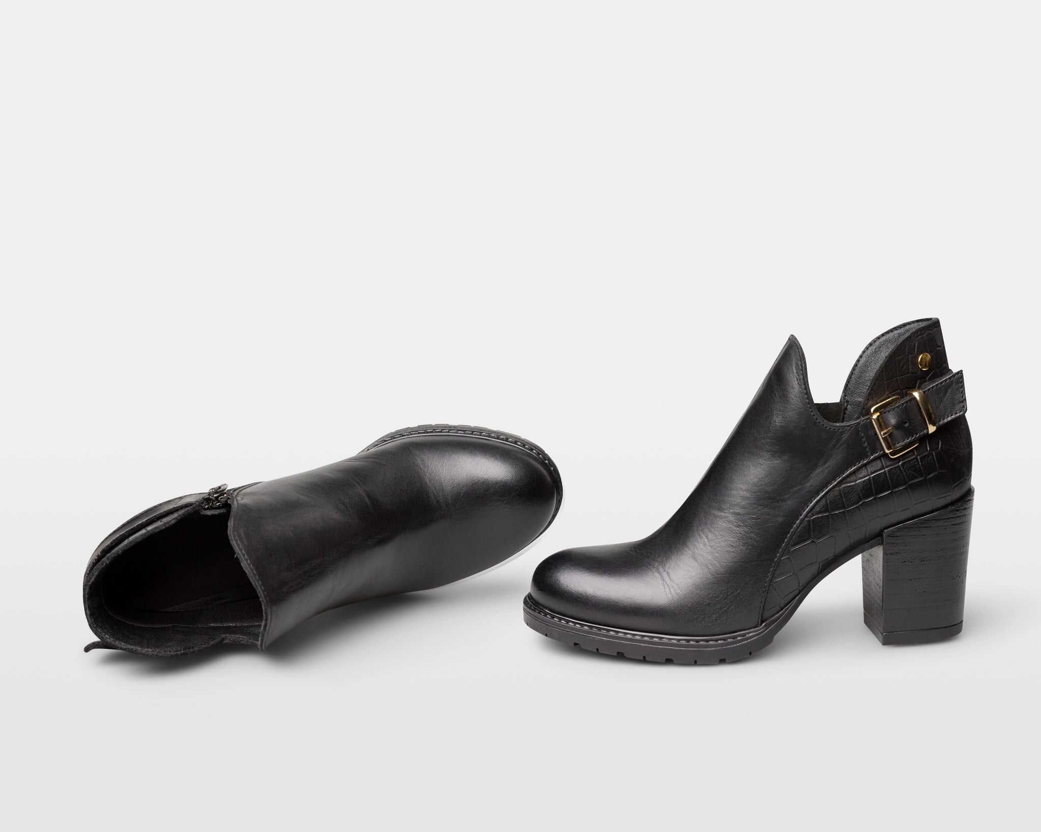 Sexy black leather ankle boots with a rounded toe, decorative buckle, reptile pattern on the back half of the boot, statement boot, comfort all day long