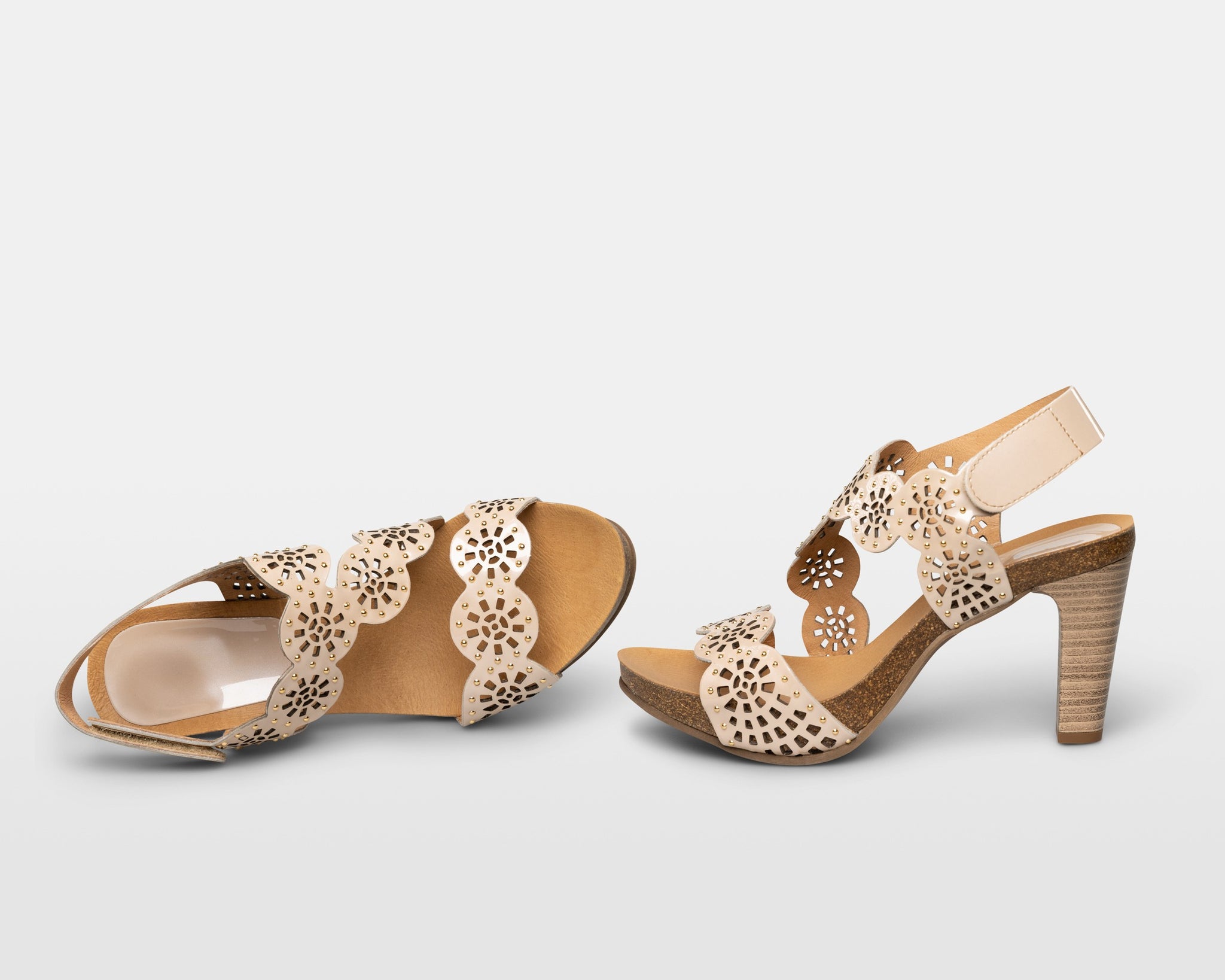 Champagne patent leather heels with gold studs, a flattering style to show off your heels, dressy or casual, you'll get compliments and comfort all day long